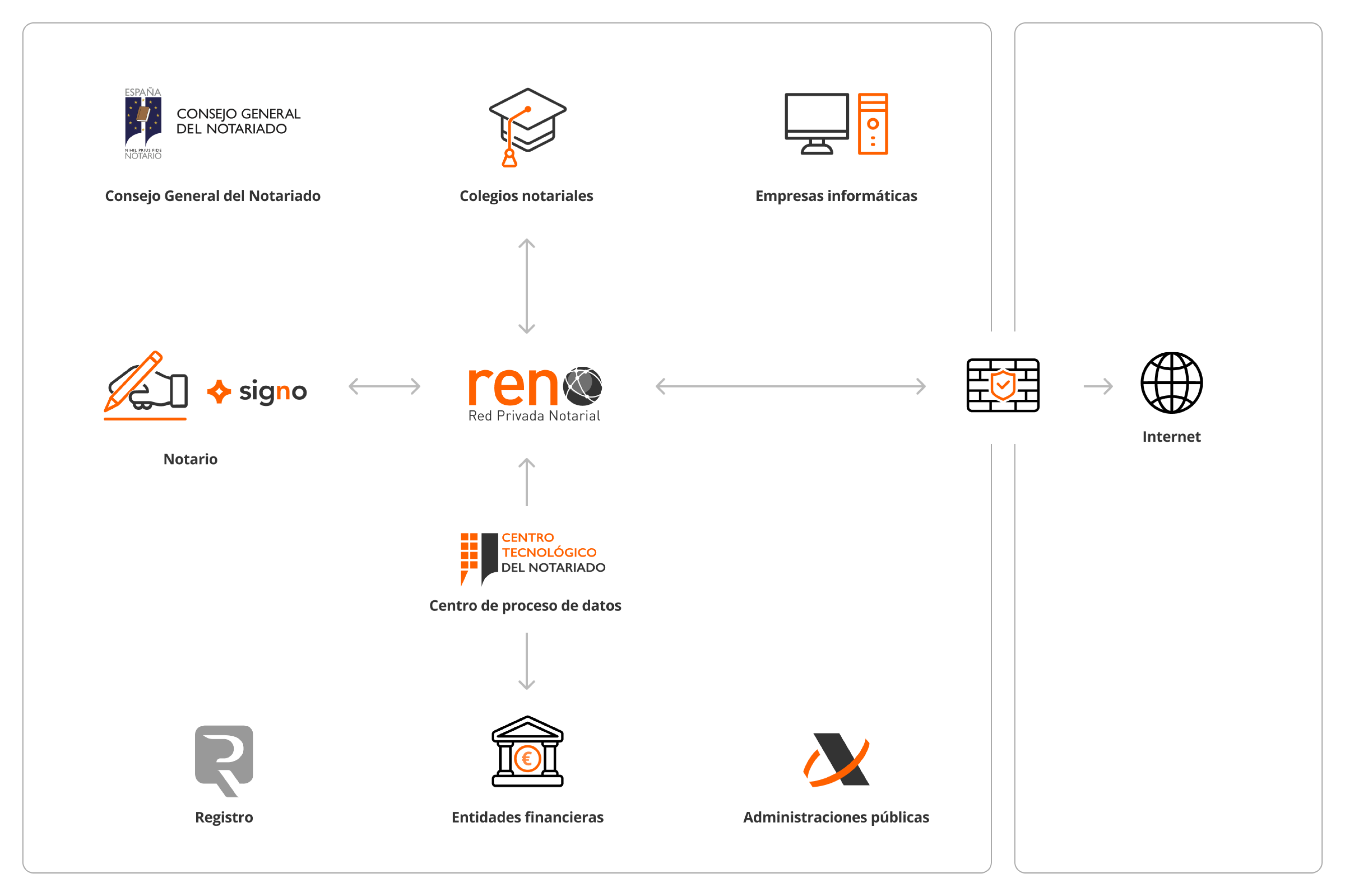 RENO se basa en una red VPN (Virtual Private Net - Red Privada Virtual) que garantiza la seguridad, cifrado e integridad de los datos y comunicaciones que circulan por este canal, que es de uso exclusivo para el Notariado y los organismos de confianza que este autorice, como las Administraciones Públicas (comunidades autónomas, Dirección General del Catastro, registros mercantiles y de la propiedad, AEAT, ayuntamientos, Registro de Últimas Voluntades, etc.) o las entidades financieras. Gracias a esta infraestructura, se gestionan más de 30 millones de documentos electrónicos al año, optimizando procesos y eliminando la necesidad de desplazamientos y documentación en papel.